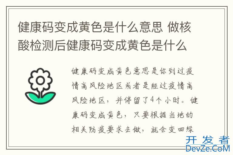 品牌型号:iPhone13 pro pro 系统:IOS15.5 软件版本:微信8.0.25健康码变成黄色意思是你到过疫情高风险地区或者是经过疫情高风险地区,并停留了4个小时。健康码变成黄色,只要根据