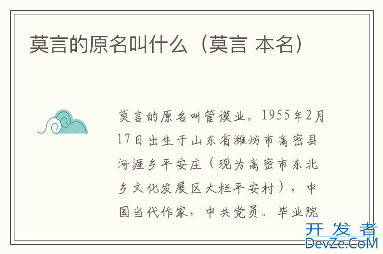 莫言的原名叫管谟业。1955年2月17日出生于山东省潍坊市高密县河涯乡平安庄(现为高密市东北乡文化发展区大栏平安村),中国当代作家,中共党员。毕业院校北京师范大学、国防大学军事文化学院。现为北京师范大