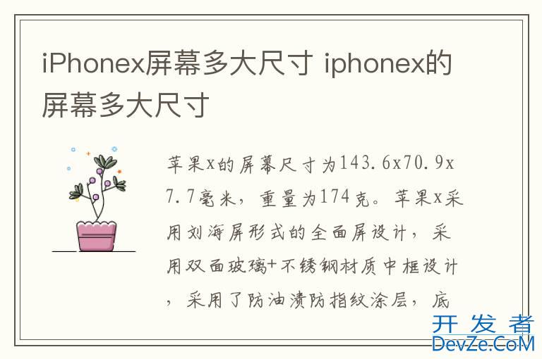 品牌型号:iPhonex 系统开发者_如何转开发:IOS15.4iPhonex的屏幕尺寸为143.6x70.9x7.7毫米,重量为174克。iPhonex采用刘海屏形式的全面屏设计,取消了iPhone