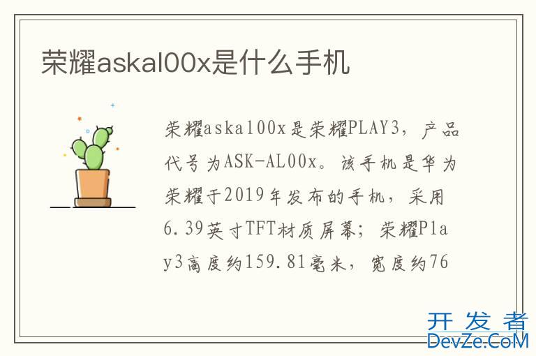 品牌型号:荣耀PLAY3 系统:EMUI 9.1.1开发者_运维知识库荣耀askal00x是荣耀PLAY3,产品代号为ASK-AL00x。该手机是华为荣耀于2019年发布的手机,采用6.39英寸TFT