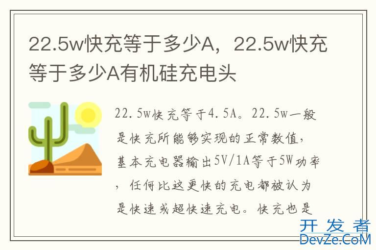 品牌型号:倍思快充 系统:CCXFK20C开发者_如何学编程 22.5w快充等于4.5A。22.5w一般是快充所能够实现的正常数值,基本充电器输出5V/1A等于5W功率,任何比这更快的充