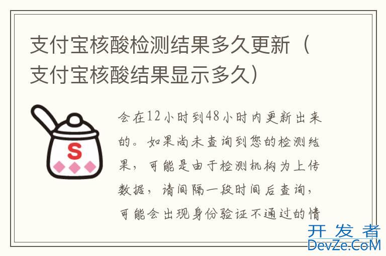 品牌型号:华为P50 系统:HarmonyOS3 软件版本:支付宝10.2.60.8000支付宝核酸检测结果会在12小时到48小时内更新出来的。如果尚未查询到您的检测结果,可能是由于检测机构为上传数据