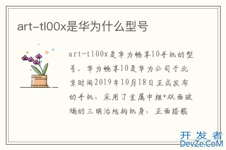 品牌型号:华为畅享10 系统:EMUI 9.1art-tl00x是华为畅享10手机的型号。华为畅享10是华为公司于北京时间2019年10月18日正式发布的手机,采用了金属中框+双面玻璃的三明治结构机身