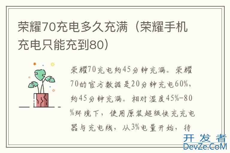 品牌型号:荣耀70 系统:Magic UI 6.1荣耀70充电约45分钟充满。荣耀70的官方数据是20分钟充电60%,约45分钟充满。但是这个是在温度25摄氏度,相对湿度45%开发者_运维技巧-80%