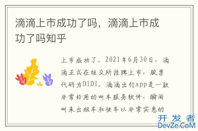 品牌型号:华为P50 系统:HarmonyOS3 软件版本:滴滴出行6.0.20滴滴上市成功了。2021年6月30日,滴滴正式在纽交所挂牌上市,股开发者_高级运维票代码为DIDI。滴滴出行app是一款