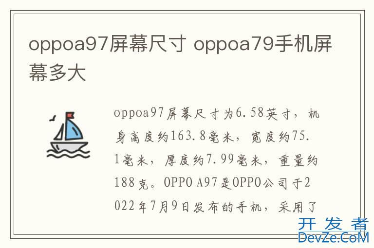 品牌型号:OPPO A97 系统:ColorOS 12oppoa97屏幕尺寸为6.58英寸,机身高度约163.8毫米,宽度约75.1毫米,厚度约7.99毫米,重量约188克。OPPO A97是OPPO