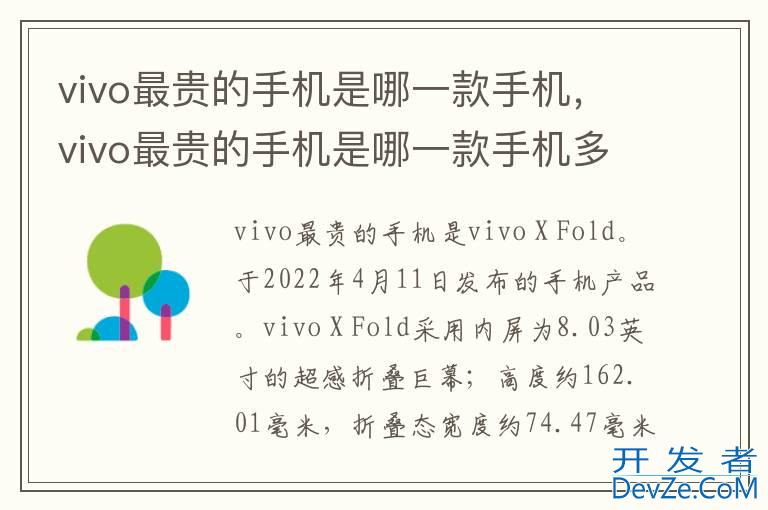 品牌型号:vivo X Fold 系统:OriginOS 1.0 vivo最贵的手机是vivo X Fold。于2022年4月11日发布的手机产品。vivo X Fold采用内屏为8.03英寸的超感折