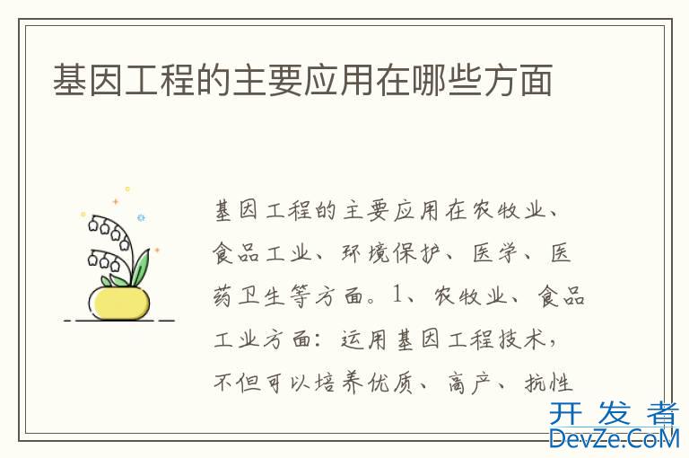 基因工程的主要应用在农牧业、食品工业、环境保护、医学、医药卫生等方面。1、农牧业、食品工业方面:运用基因工程技术,不但可以培养优质、高产、抗性好的农作物及畜、禽新品种,还可以培养出具有特殊用途的动、植