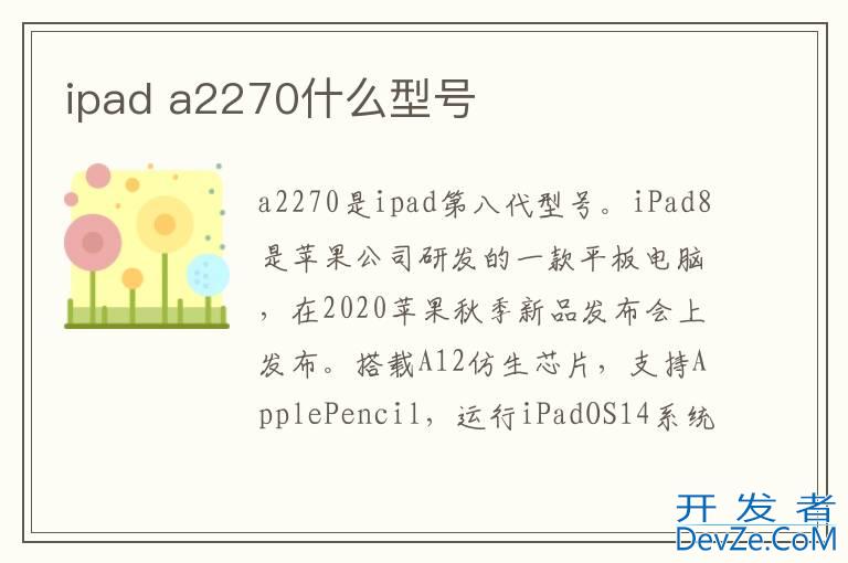 品牌型号:ipad8 系统:iPad airOS14a2270是ipad第八代型号。iPad air8是iPhone公司研发的一款平板电脑,在2020iPhone秋季新品发布会上发布。搭载A12仿生芯