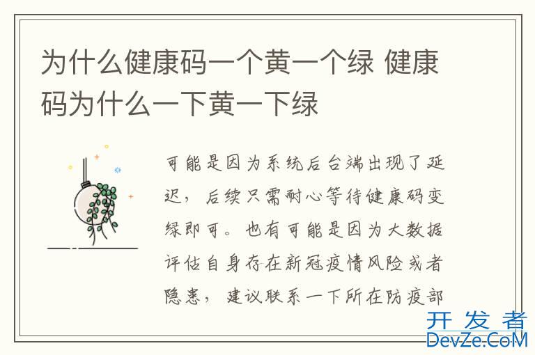 品牌型号:华为P50 系统:HarmonyOS3 软件版本:微信8.0.18健康码一个黄一个绿,出现这种情况可能是因为系统后台端出现了延迟,后续只需耐心等待健康码变绿即可,工作人员会在后台进行修复。也