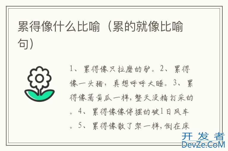 1、累得像只拉磨的驴。2、累得像一头猪,真想呼呼大睡。3、累得像蔫黄瓜一样,整天没精打采的。4、累得像像停摆的破l日风车。5、累得像散了架一样,倒在床上就打起了呼噜。6、累的像打了霜的茄子,又蔫又疲,