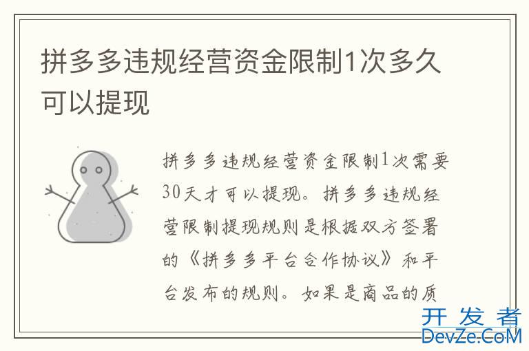 品牌型号:开发者_运维技巧vivo X70 Pro 系统:OriginOS 1.0 软件版本:拼多多6.9.0拼多多违规经营资金限制1次需要30天才可以提现。拼多多违规经营限制提现规则是根据双方签署