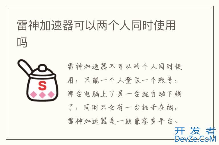 品牌型号:iPhone13 pro pro 系统:IOS15.4 软件版本:雷神加速器7.5.0.2雷神加速器不可以两个人同时使用,只能一个人登录一个账号,那台电脑上了另一台就自动下线了,同时只会有一