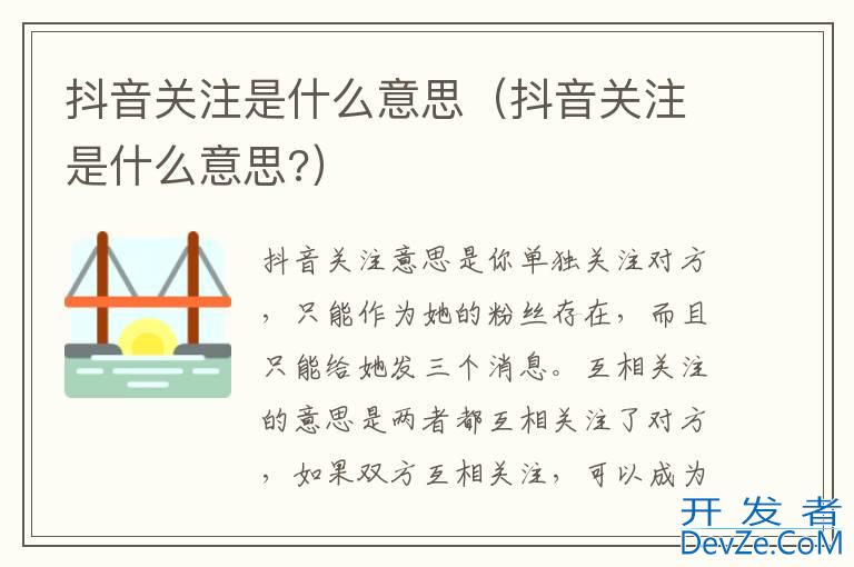 品牌型号:华为p50 系统:HarmonyOS 3 软件版本:抖音20.5.0抖音关注意思是你单独关注对方,只能作为她的粉丝存在,而且只能给她发三个消息。互相关注的意思是两者都互相关注了对方,如果双方