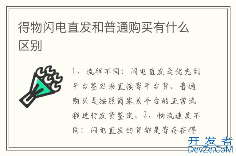 品牌型号:华为p50 系统:HarmonyOS 3 软件版本:得物4.92.51、流程不同:闪电直发是优先到平台鉴定或直接寄平台货。普通购买是按照商家或平台的正常流程进行发货鉴定。2、物流速度不同:闪