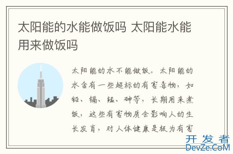 品牌型号:四季沐歌太阳能 系统:18管太阳能的水不能做饭。太阳能的水含有一些超标的有害毒物,如铅、镉、锰、砷等,长期用来煮饭,这些有害物质会影响人的生长发育,对人体健康是极为有害。并且太阳能里的水往往