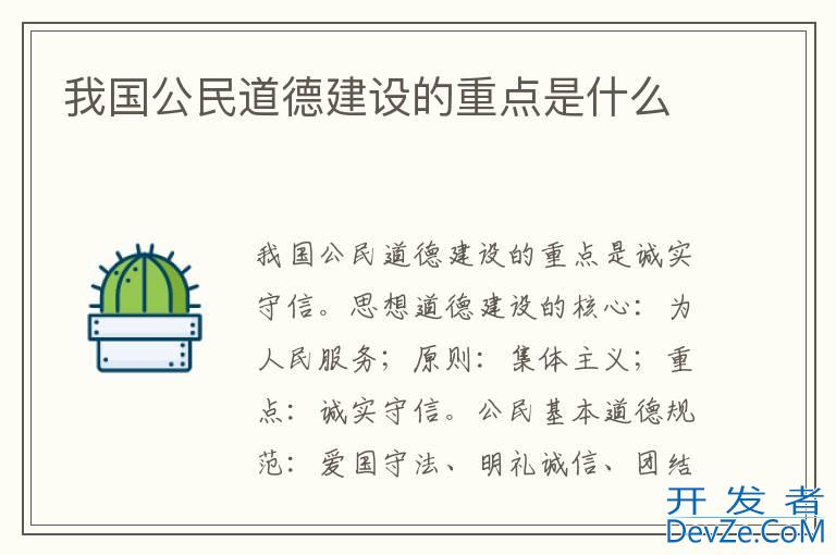 我国公民道德建设的重点是诚实守信。思想道德建设的核心:为人民服务;原则:集体主义;重点:诚实守信。公民基本道德规范:爱国守法、明礼诚信、团结友善、勤俭自强、敬业奉献。教育、科学、文化建设的根本任务:提
