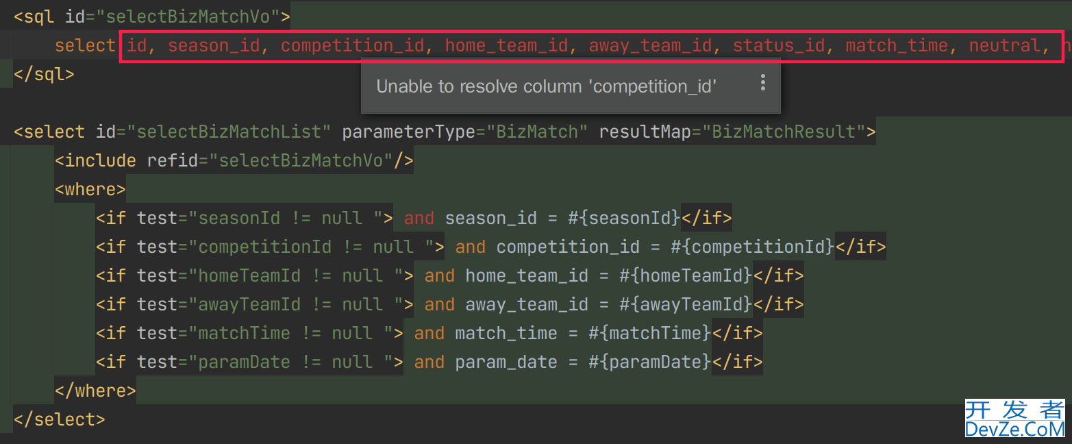现象 在http://www.devze.comIDEA中已经配置好Databa编程客栈开发者_Python入门se了,但是打开myBATispython的Mapper.XML中的字段还是报红。如下 :
