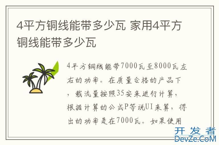 品牌型号:德力西铜线 系统:BV-4R4平方铜线能带7000瓦至8000瓦左右的功率。在质量合格的产品下,载流量按照35安来进行计算,根据计算的公式P等说UI来算,得出的功率是在7000瓦。如果使用是