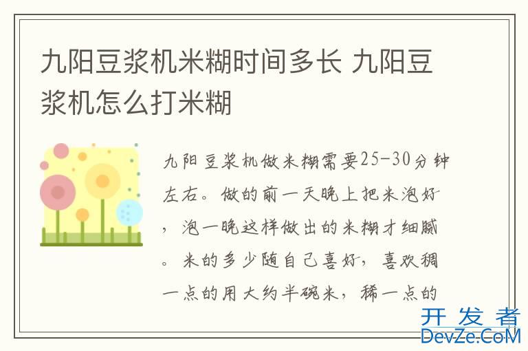 品牌型号:九阳豆浆机 系统:DJ13B-D08EC开发者_StackOverflow中文版 九阳豆浆机做米糊需要25-30分钟左右。做的前一天晚上把米泡好,泡一晚这样做出的米糊才细腻。米的多少随
