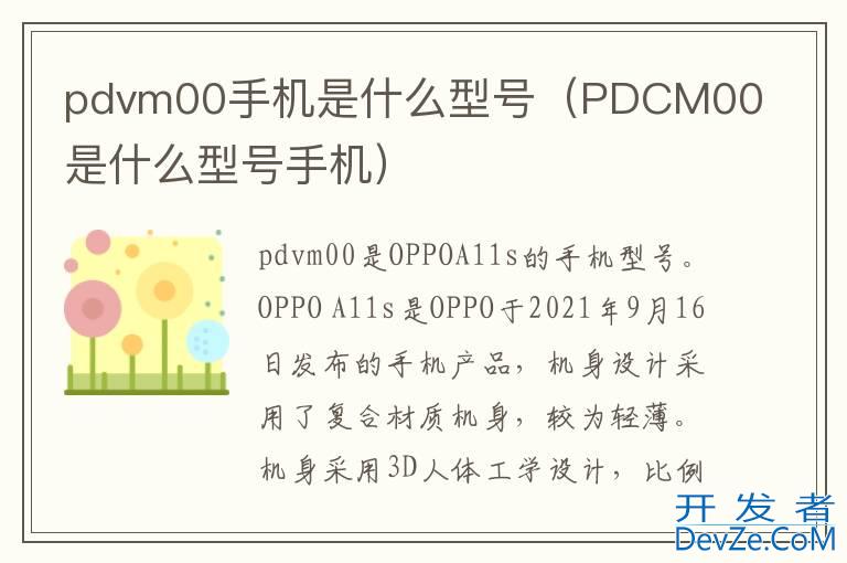 品牌型号:OPPOA11s 系统:colorOS12.1开发者_JS百科 pdvm00是OPPOA11s的手机型号。OPPO A11s是OPPO于2021年9月16日发布的手机产品,机身设计采