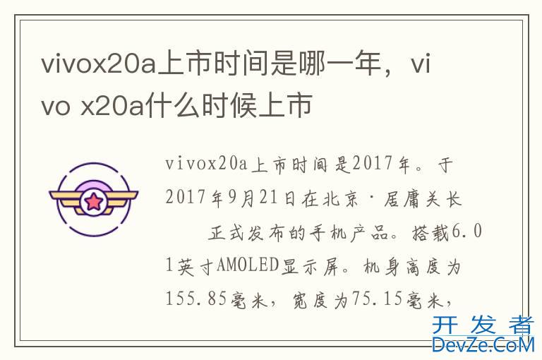 品牌型号:vivox20a 系统:FuntouchOS3.2vivox20a上市时间是2017年。于2017年9月21日在北京·居庸关长城正式发布的手机产品。搭载6.01英寸AMOLED显示屏,背部采