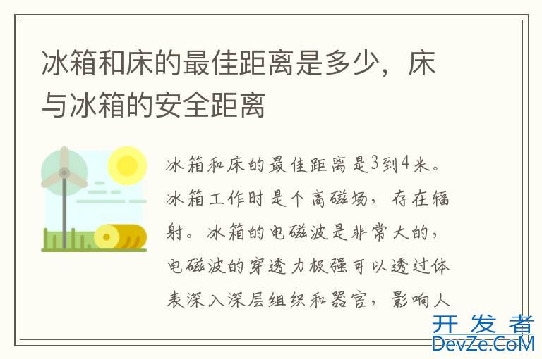 品牌型号:海尔冰箱 系统:BCD-477WDPCU1冰箱和床的最佳距离是3到4米。冰箱工作时是个高磁场,存在辐射。冰箱的电磁波是非常大的,电磁波的穿透力极强可以透过体表深入深层组织和器官,影响人的神经