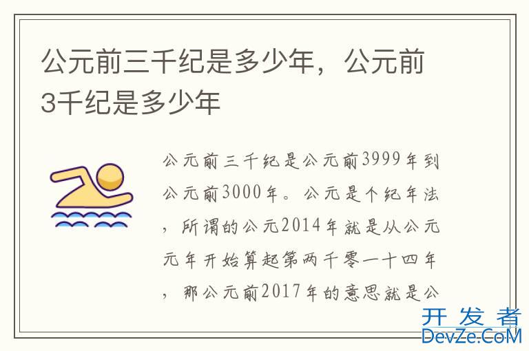 公元前三千纪是公元前3999年到公元前3000年。公元是个纪年法,所谓的公元2014年就是从公元元年开始算起第两千零一十四年,那公元前2017年的意思就是公元元年以前第两千零十七年。需要注意的是,不存
