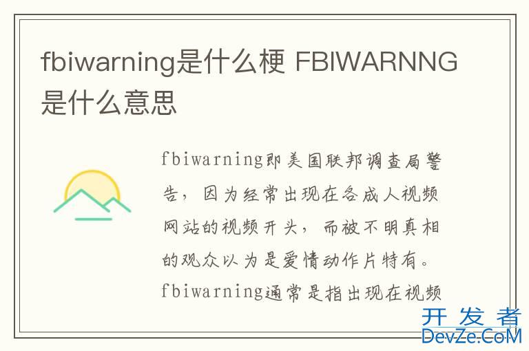 fbiwarning即美国联邦调查局警告,因为经常出现在各成人视频网站的视频开头,而被不明真相的观众以为是爱情动作片特有。fbiwarning通常是指出现在视频正片前的版权保护信息。内容通常是警告观众