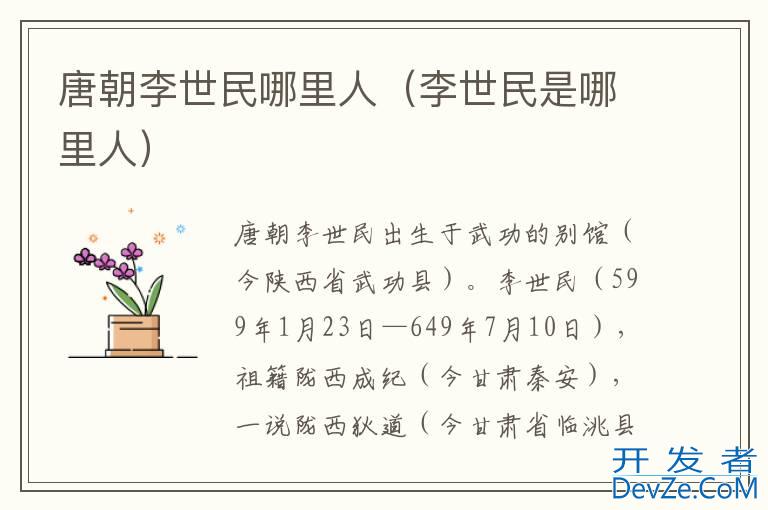 唐朝李世民出生于武功的别馆(今陕西省武功县)。李世民(599年1月23日—649年7月10日),祖籍陇西成纪(今甘肃秦安),一说陇西狄道(今甘肃省临洮县)人,又说钜鹿郡人。唐朝第二位皇帝(626年—6
