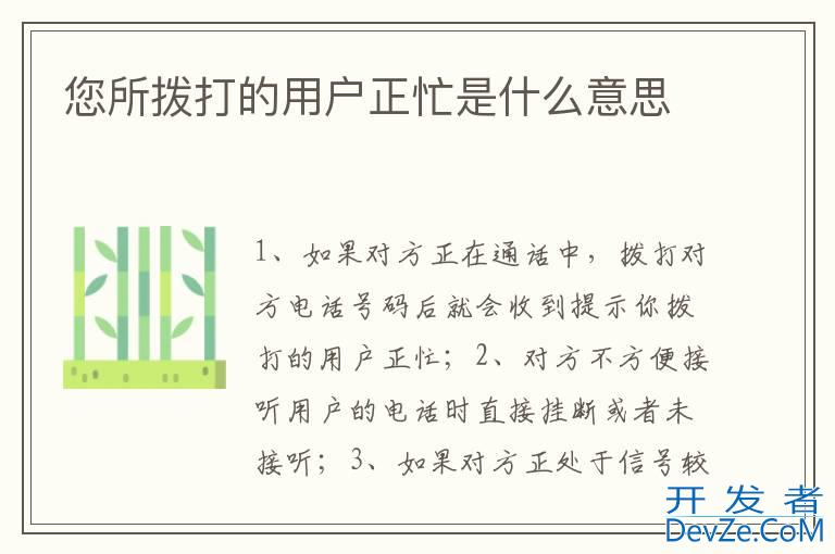 品牌型号:iPhone13 pro pro 系统:IOS15.5您所拨打的用户正忙有以下5种可能:1、如果对方正在通话中,拨打对开发者_开发知识库方电话号码后就会收到提示你拨打的用户正忙;2、对方不方