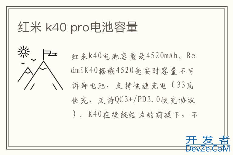 品牌型号:Redmi K40 系统:MIUI 12红米 k40 pro电池容量是4520mAh。RedmiK40搭载4520毫安时容量不可拆卸电池,支持快速充电(33瓦快充,支持QC3+/PD3.0快