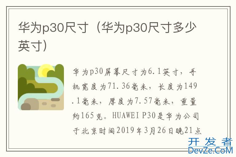 品牌型号:HUAWEI P30 系统:HarmonyOS 2华为p30屏幕尺寸为6.1英寸,手机宽度为71.36毫米,长度为149.1毫米,厚度为7.57毫米,重量约165克。HUAWEI P30是华