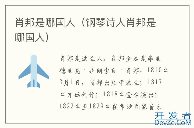 开发者_StackOverflow中文版 肖邦是波兰人。肖邦全名是弗里德里克·弗朗索瓦·肖邦,1810年3月1日,肖邦出生于波兰;1817年开始创作;1818年登台演出;1822年至182