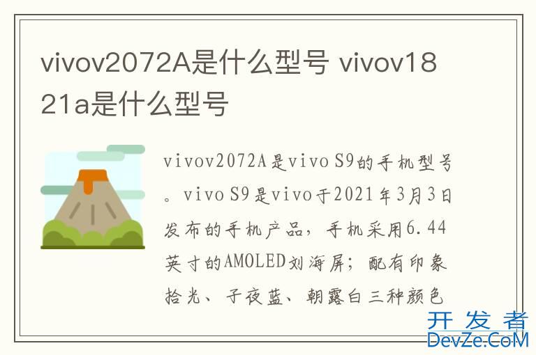 品牌型号:vivo S9 系统:OriginOS 2.0vivov2072A是vivo S9的手机型号。vivo S9是vivo于2021年3月3日发布的手机产品,手机采用6.44英寸的AMOLED刘