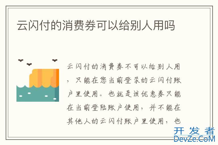 开发者_运维知识库品牌型号:iPhone13 pro pro 系统:iOS 15.6.1 软件版本:云闪付9.2.2云闪付的消费券不可以给别人用,只能在您当前登录的云闪付账户里使用。也就是该优惠券只能