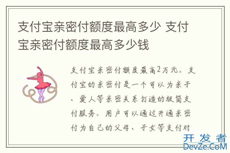 品牌型号:iPhone13 pro pro 系统:iOS 15.6.1 软件版本:支付宝10.2.90支付宝亲密付额度最高2万元。支付宝的亲密付是一个可以为亲子、爱人等亲密关系打造的极简支付服务。用户