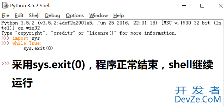 方法1:采用sys.exit(0),正常终止程序,从图中可以看到,程序终止后shell运行不受影响。