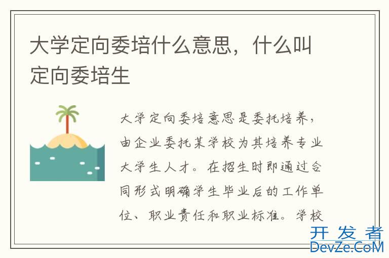 大学定向委培意思是委托培养,由企业委托某学校为其培养专业大学生人才。在招生时即通过合同形式明确学生毕业后的工作单位、职业责任和职业标准。学校根据企业的要求制定教材,教授学生课程,培养符合企业需求的人才