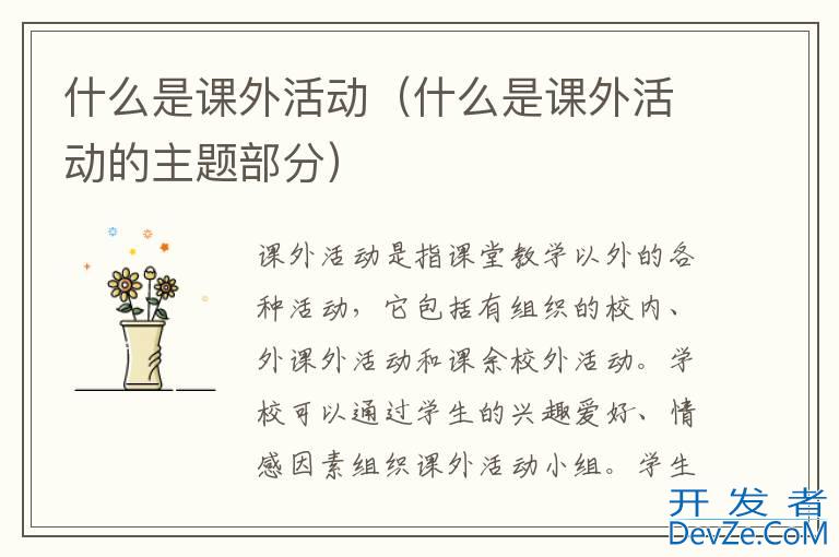 开发者_如何学Python 课外活动是指课堂教学以外的各种活动,它包括有组织的校内、外课外活动和课余校外活动。学校可以通过学生的兴趣爱好、情感因素组织课外活动小组。学生可以从中获得知识信息、发展