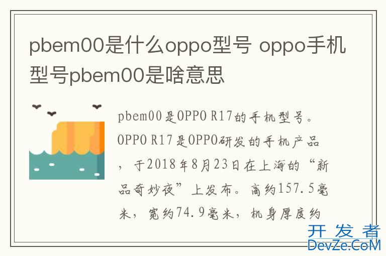 品牌型号:OPPO R17 系统:colorOS12.1pbem00是OPPO R17的手机型号。OPPO R17是OPPO研发的手机产品,于2018年8月23日在上海的“新品奇妙夜”上发布。高约15