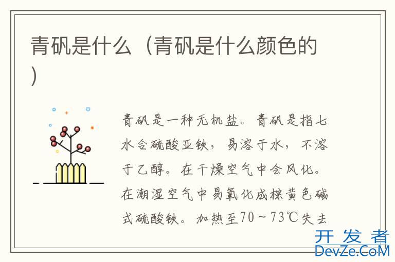 青矾是一种无机盐。青矾是指七水合硫酸亚铁,易溶于水,不溶于乙醇。在干燥空气中会风化。在潮湿空气中易氧化成棕黄色碱式硫酸铁。加热至70~73℃失去3分子水,至80~123℃失去6分子水,至1开发者_Py