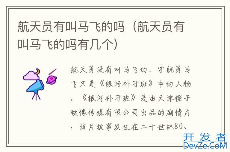 航天员没有叫马飞的。宇航员马飞只是《银河补习班》中的人物。《银河补习班》是由天津橙子映像传媒有限公司出品的剧情片,由邓超、俞白眉联合执导,邓超领衔主演,白宇、任素汐、王西、孙浠伦、李建义、梁超等主演。