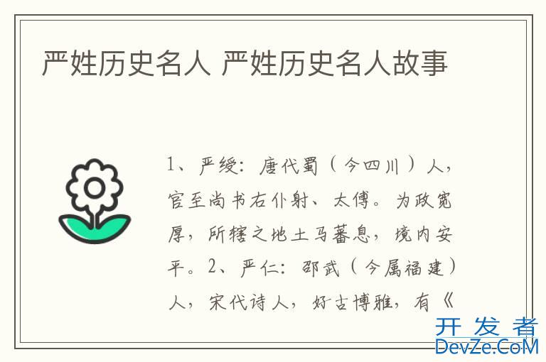 1、严绶:唐代蜀(今四川)人,官至尚书右仆射、太傅。为政宽厚,所辖之地土马蕃息,境内安平。2、严仁:邵武(今属福建)人,宋代诗人,好古博雅,有《清江矣欠乃集》流于世。3、严羽:邵武人,宋代文学理论家,