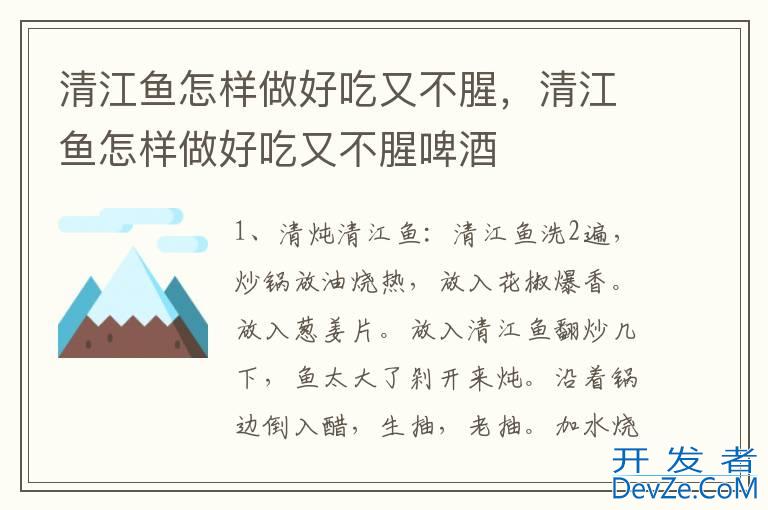 1、清炖清江鱼:原料:清江鱼、葱、植物油、姜片、花椒、八角、生抽、老抽、盐、白糖、蒜片。做法:清江鱼洗2遍,炒锅放油烧热,放入花椒爆香。放入葱姜片。放入清江鱼翻炒几下,鱼太大了剁开来炖。沿着锅边倒入醋