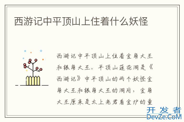 开发者_如何学JAVA 西游记中平顶山上住着金角大王和银角大王。平顶山莲花洞是《西游记》中平顶山的两个妖怪金角大王和银角大王的洞府,金角大王原来是太上老君看金炉的童子,银角大王是看银炉的童子。《西游