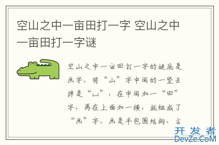 空山之中一亩田打一字的谜底是画字。将“山”字中间的一竖去掉是“凵”,在中间加一“田”字,再在上面加一横,就组成了“画”字。画是半包围结构,古字形上部表示以手执笔,下部是笔画出的线条。画的本义是用笔描绘