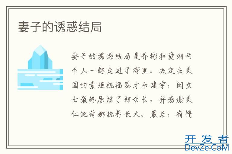 妻子的诱惑结局是乔彬和爱利两个人一起走进了海里。决定去美国的素姬祝福恩才和建宇,闵女士最终原谅了郑会长,并感谢美仁把荷娜抚养长大。最后,有情人终成眷属,恩才和建宇在海边互戴戒指,相拥看海。《妻子的诱开
