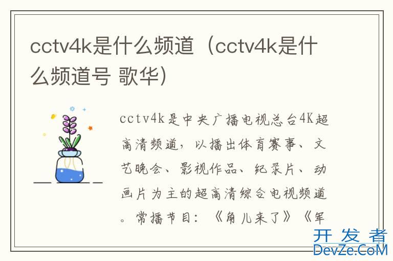 cctv4k是中央广播电视总台4K超高清频道,以播出体育赛事、文艺晚会、影视作品、纪录片、动画片为主的超高清综合电视频道。常播节目:《角儿来了》《军武零距离》《云朵上的民族》《远方的家》《乐享汇》《美