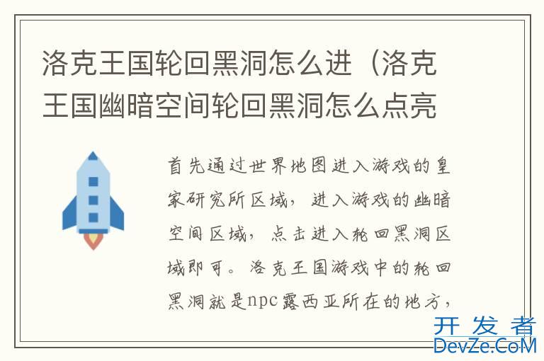 开发者_如何学编程 首先通过世界地图进入游戏的皇家研究所区域,进入游戏的幽暗空间区域,点击进入轮回黑洞区域即可。洛克王国游戏中的轮回黑洞就是npc露西亚所在的地方,我们进入